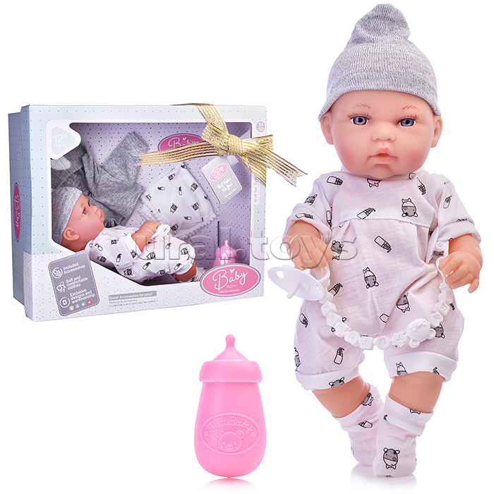 Милый и очаровательный пупс – великолепный подарок для девочек! Одет в шортики и чепчик, но в комплект входит дополнительный набор одежды и плед, чтобы отправиться на прогулку. Ручки и ножки двигаются. Пупсика можно купать, переодевать, кормить (бутылочка входит в комплект). Девочка охотно станет для него любящей и заботливой мамой.