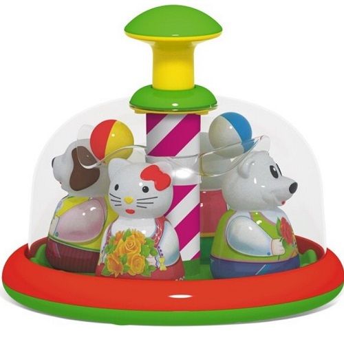Юла-карусель «Аттракцион» – это развивающая игрушка для самых маленьких. Она напоминает детский аттракцион в парке с катающимися на нем зверушками. Малыш сам сможет запускать юлу-карусель и влиять на скорость вращения карусели, нажимая на большую кнопку сверху. После запуска зверушки в ярких костюмах начинают вращаться, привлекая внимание малыша. Под куполом юлы на прозрачной площадке находятся разноцветные шарики, которые при движении выкатываются к стенке купола, а при остановке возвращаются на свои места.